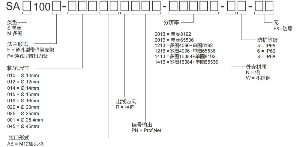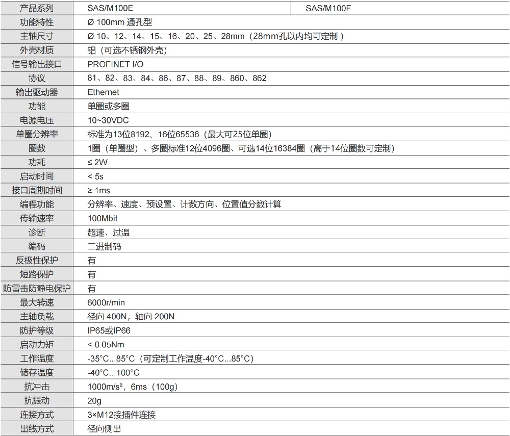 大通孔总线型输出,让安装更为简单高精度光学感应技术,单圈或多圈编码器单圈分辨率最高可达25位,多圈圈数标准高达14ProfiNet I/O总线最大速率100Mbit,版本为2.44位,或定制更高圈数超强的抗磁场干扰能力,LED状态显示具备反短接和短路保护、有效降低安装错误对编码器造成影响